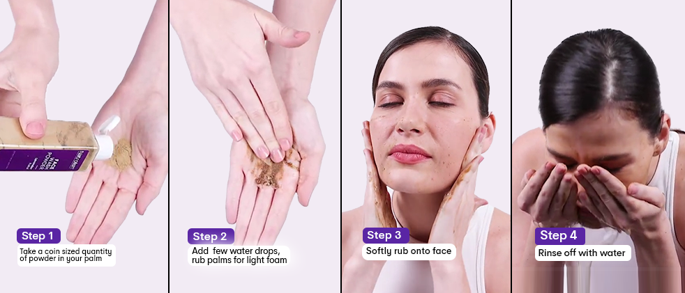 Simply pour, activate, and glow. Sprinkle a small amount into your palm, add few drops of water, and lather. Massage gently, then rinse. Itโs that easy.